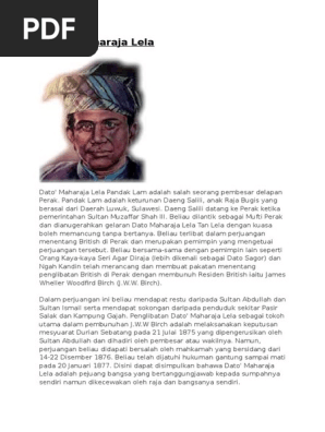 Dato Maharaja Lela died on 20 January 1877 was a Malay nationalist from Perak. Daeng Salili Anak raja Bugis Asal. Kesan penentangan dato maharaja lela di.
